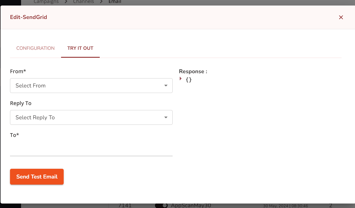 - Click Send Test Email to see the response of the API on the right-hand side, and on successful, you will receive an email.