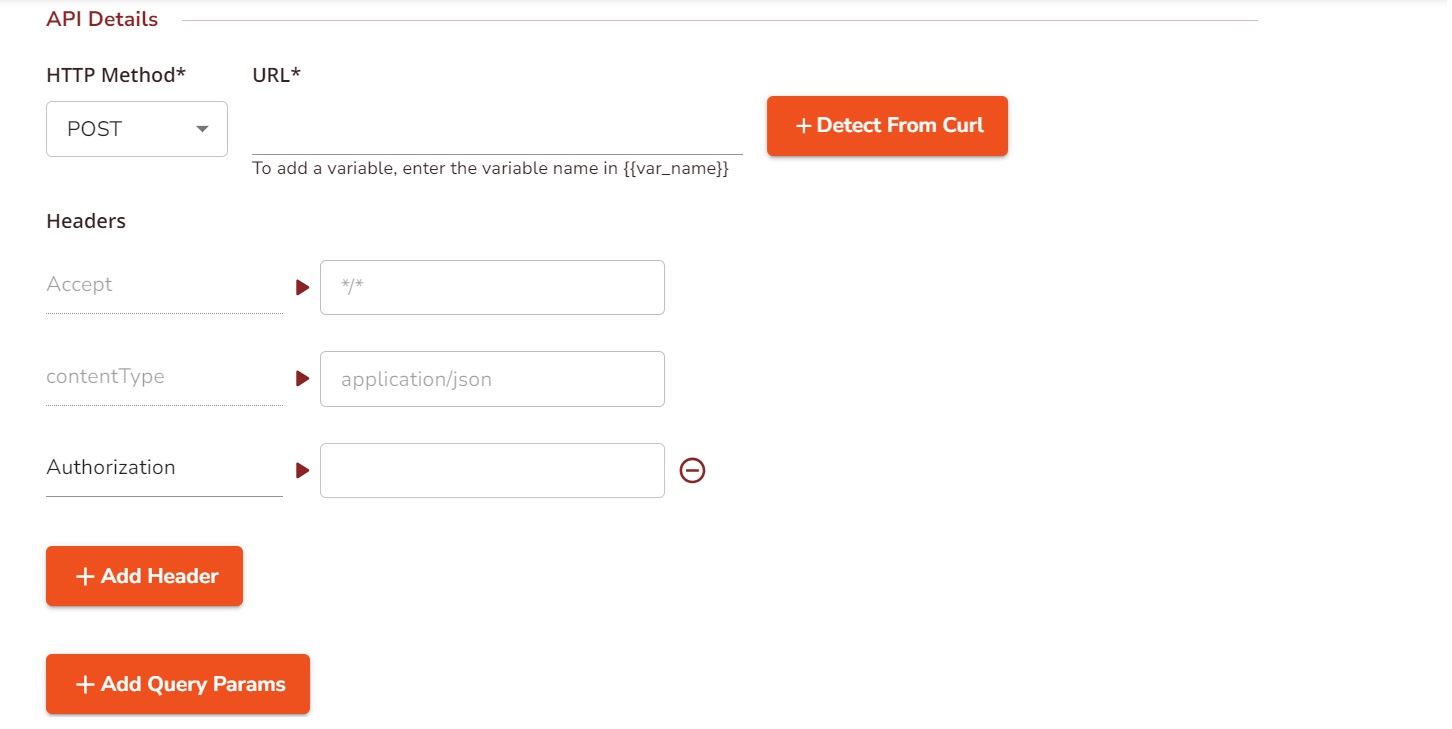 - In the Enter Curl textbox, include the curl command to automatically fetch headers and payload from an API and populate them into relevant fields. This command assumes that you have an API endpoint to retrieve the data in JSON format and that the API requires an authorization token.