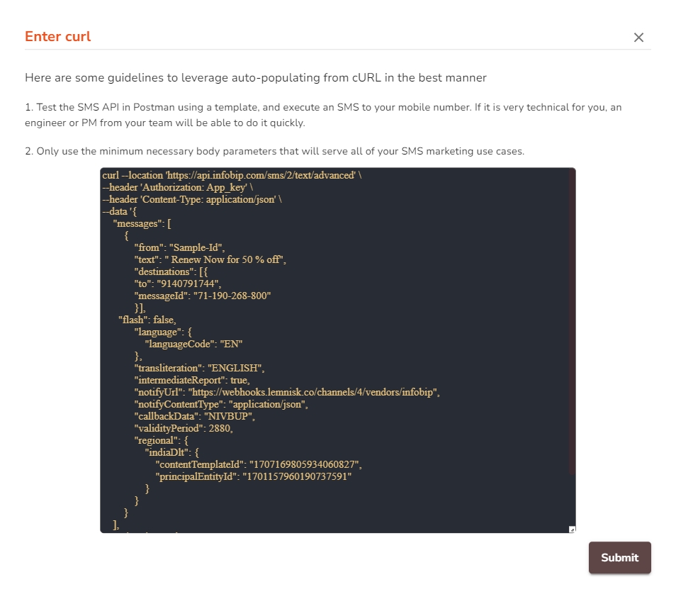 - Assign authorization keys, senderID (if present), sender number, and other essential global constants in the appropriate places in the API. Configure these usually in the URL parameters or header parameters.