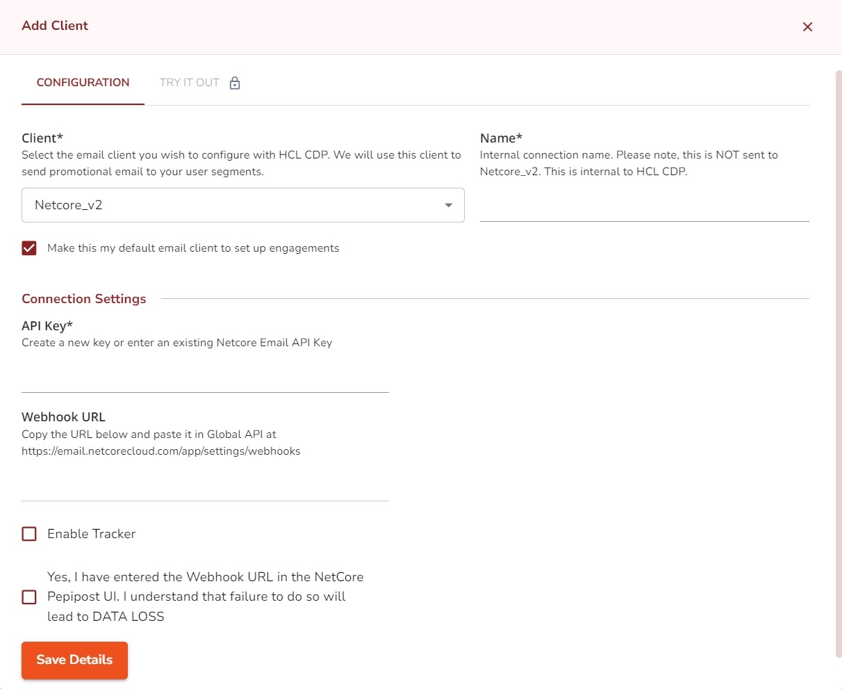 - In the Add Client page, on the CONFIGURATION tab, in the Client field, select Netcore from the list of SSPs.