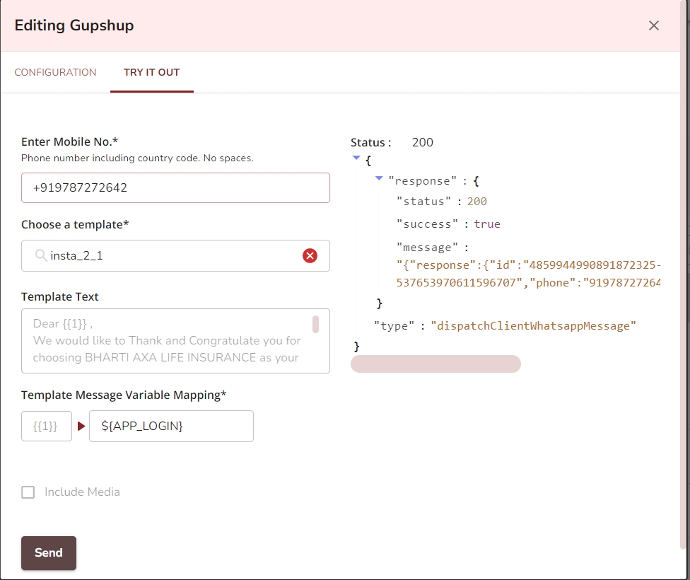 Choose the template for your communication that has to be sent in WhatsApp. The upcoming field will be displayed as per the requirement of the template configured in Gupshup