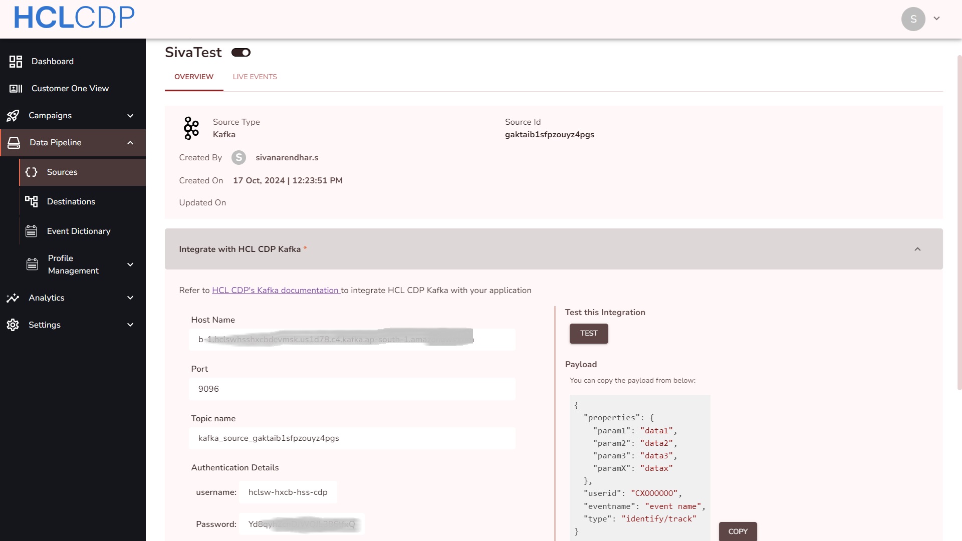 Payload: The correct format for the payload to send events will be displayed here. You can copy the payload and use it while sending Kafka events.