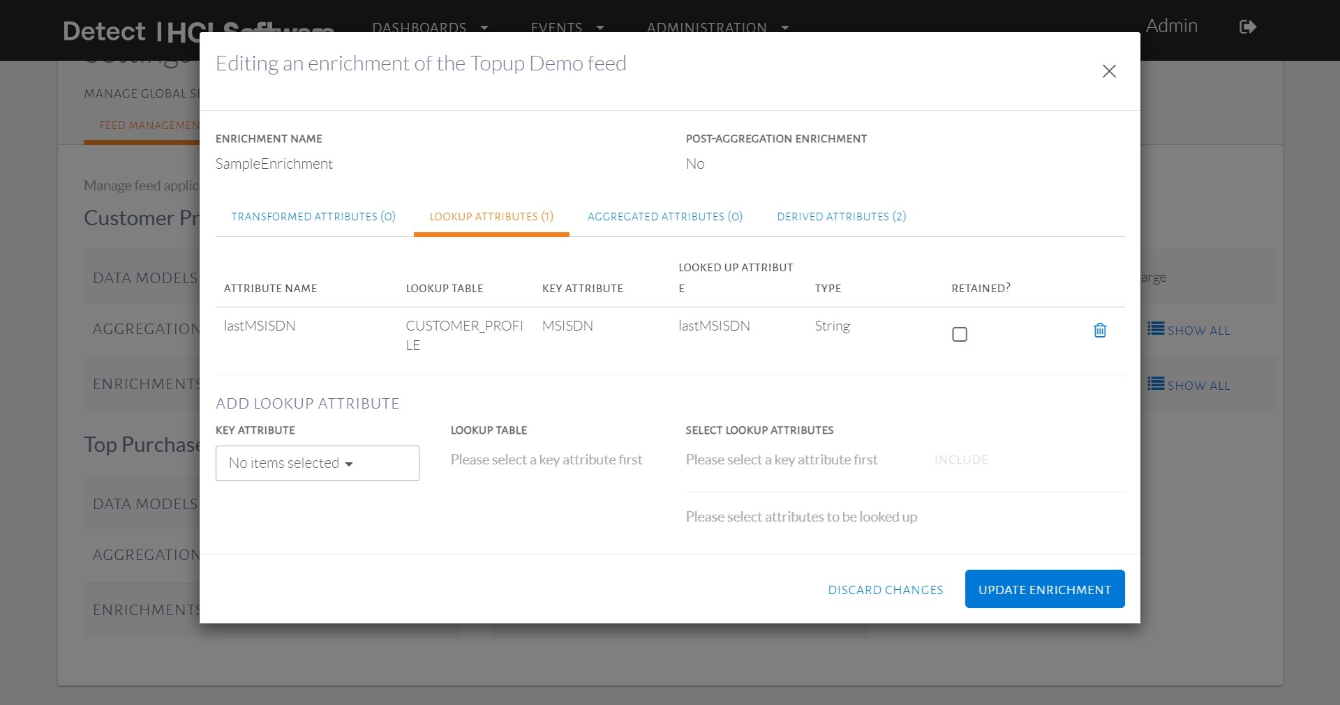 Pinpointtable will be listed inLookup Tabledrop-down, finally we have to select the attribute from the lookup table to be looked up. - The aggregate-based enrichment, which fetches data from