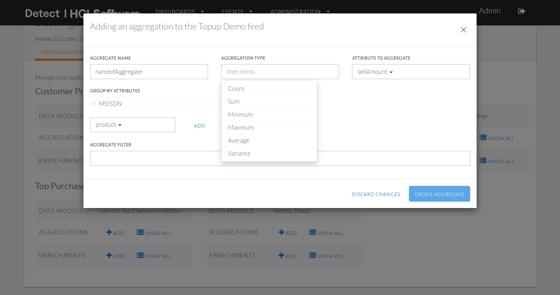 The existing aggregates configured for a feed application can be seen by clicking on