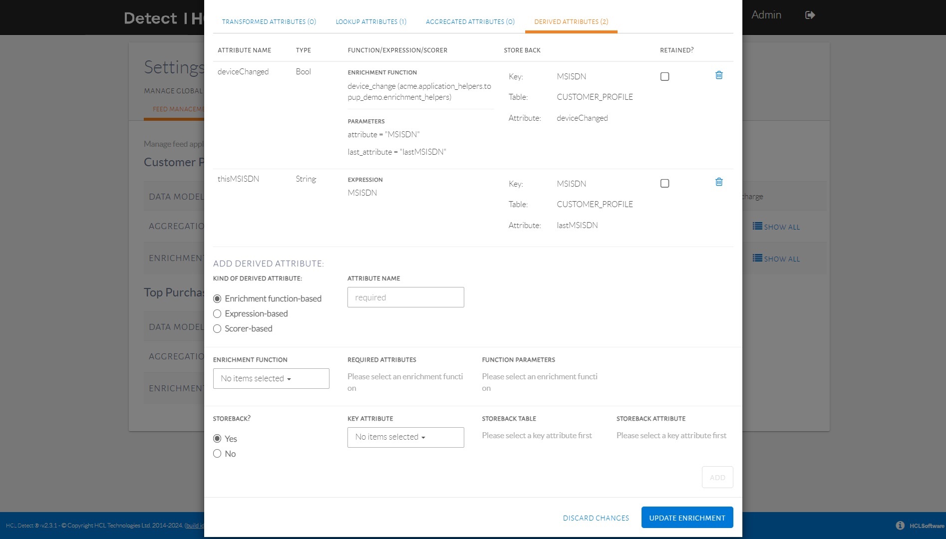 Interface for editing derived attribute type enrichments.