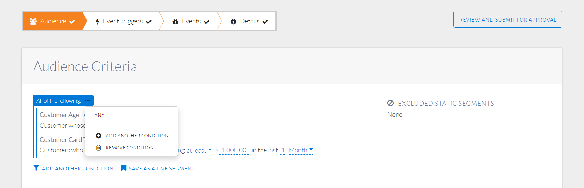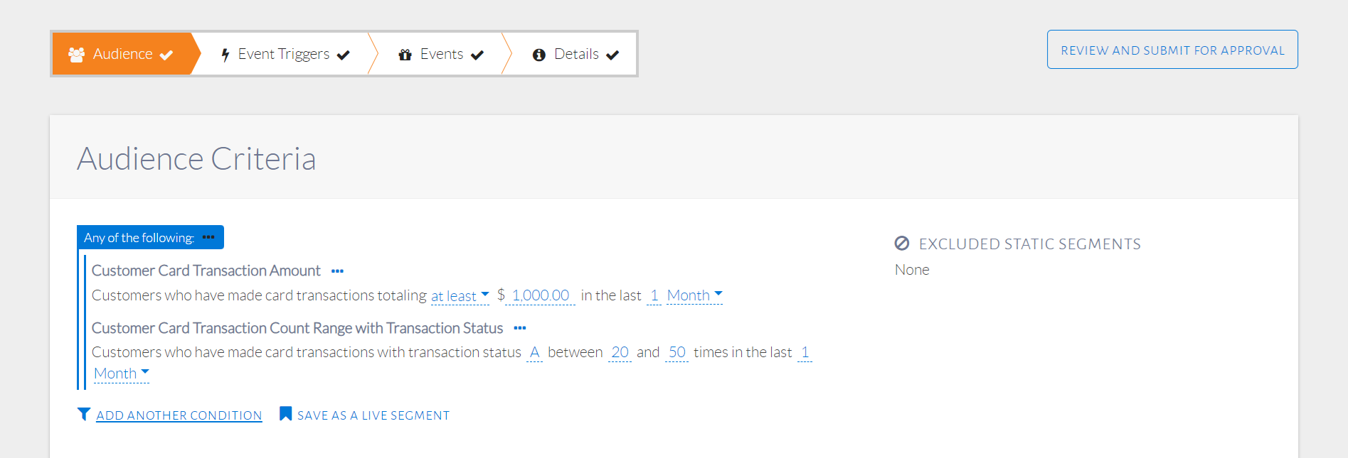 A static segment is a saved set of customers. It is different from a live segment in the sense that a live segment saves audience conditions, which are the basis of selecting customers as part of that segment. A static segment, on the other hand, saves specific customers. These specific customers can be chosen through the events step of configuration. Once a customer is saved in a static segment, they will always be part of that static segment until explicitly removed by the user, unlike with live segments.