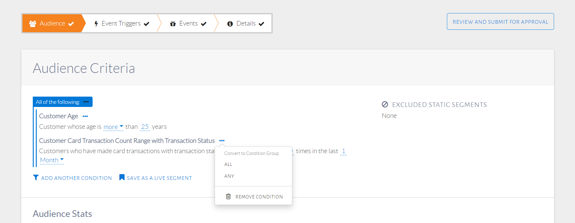Recall the previous audience condition setup which included Married customers with at least $1,000 spent in the last 1 month. Set up those conditions. Click the ellipsis button beside an individual condition to see options that convert it into an ANY condition group or remove the individual condition, as seen in the image below. Alter the condition to ANY.