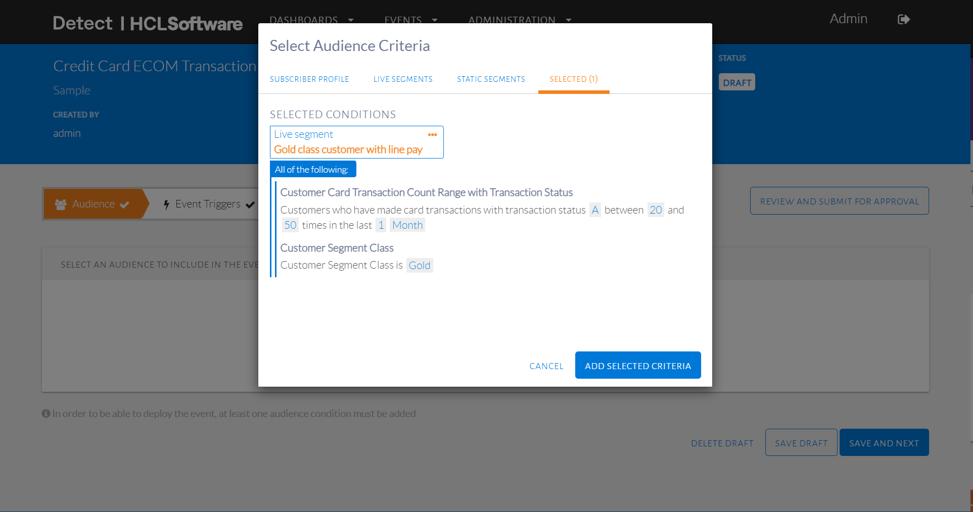- Select name of live segment and click Add Selected Criteria.