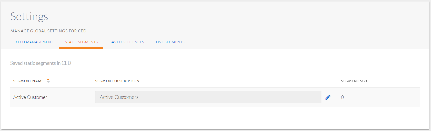 A page will be displayed as seen in the image below. The static segments can be seen along with a description for each. The segment size is also shown, which is the number of customers in each static segment. Similarly, all Live Segments can be viewed in its respective tab. Both of these tabs show all segments configured by any user as they are usable by any user.