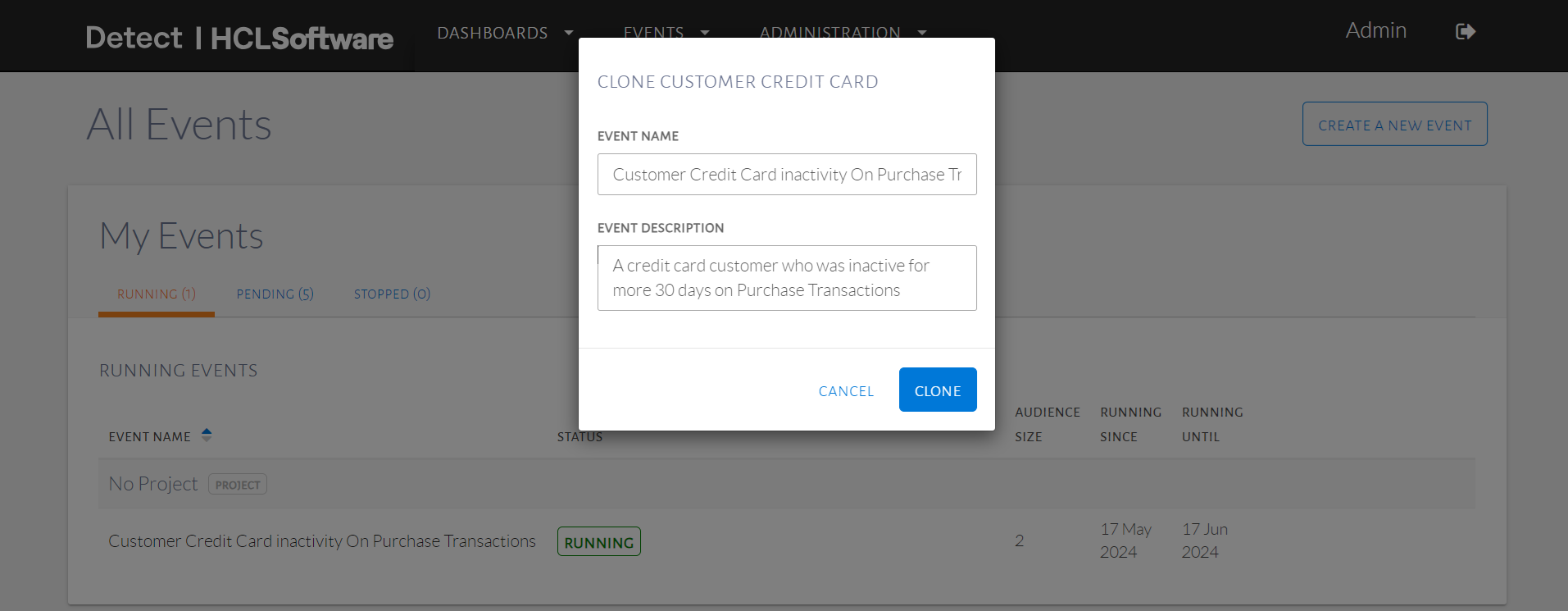 The Event Name needs to be unique so the event can be cloned. An error message will appear if the name is not unique. Select the running event to clone and edit the name as shown in the image below as we can now edit the event to target Payment based customer inactivity in the audience while keeping all other event configurations the same.
