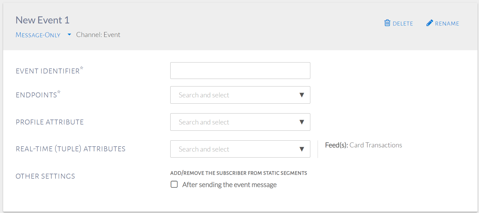 Message-Only events are used when an event needs to be sent out each time audience & trigger conditions are met. This is the default selection in the Events tab. Inputs to be provided are shown in the image below. Mandatory fields are marked with an asterisk in the UI, without which the user cannot progress.