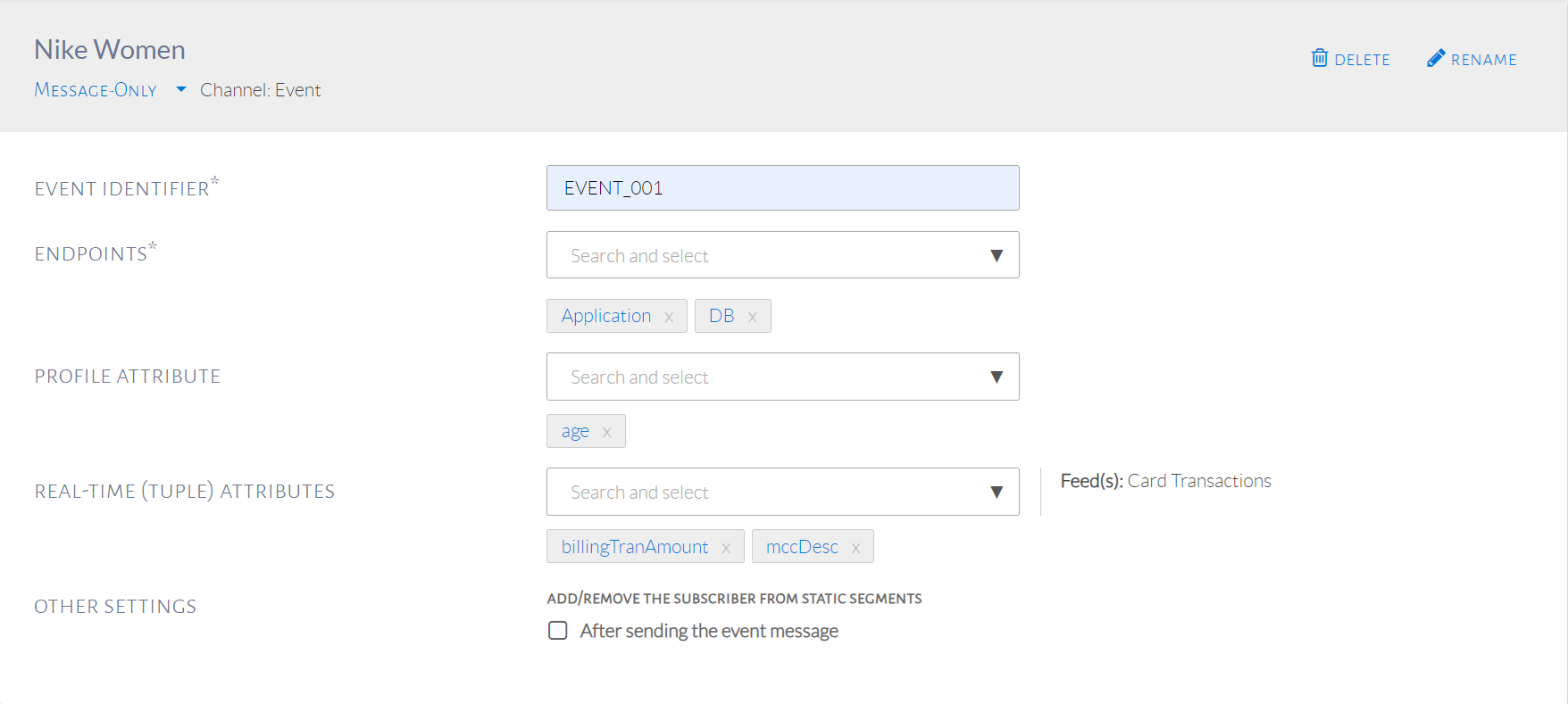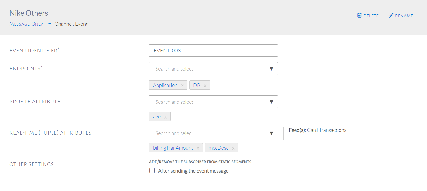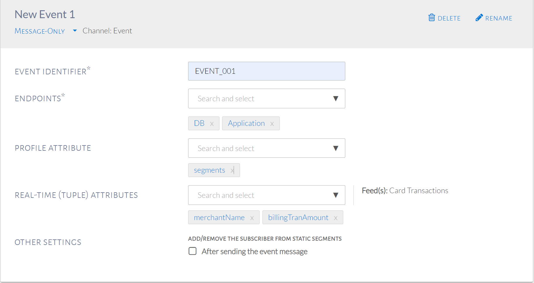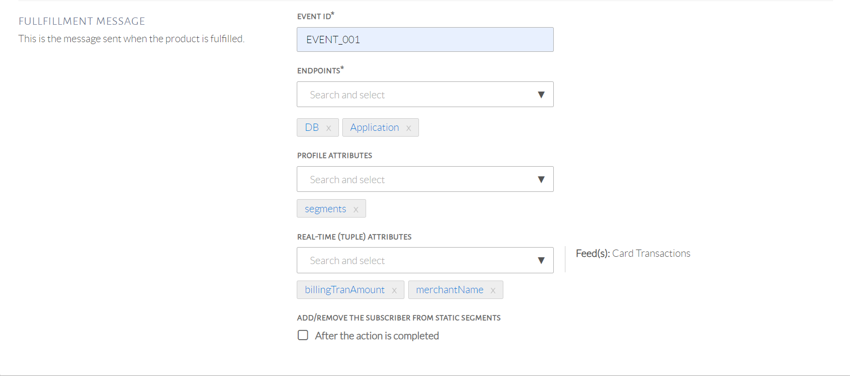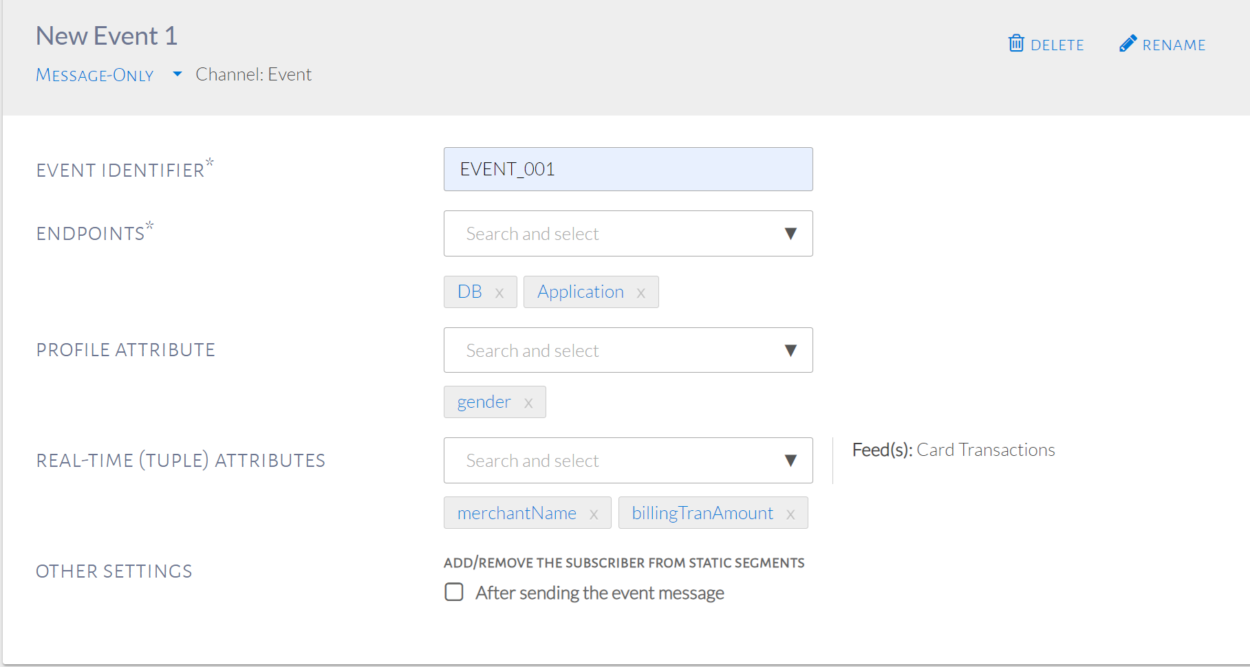 There are two event types to choose from: Message-Only & Action-Based. Both events require an Event ID and Endpoint to be selected. Additionally, the UI allows attributes from each data source to be selected which is forwarded to the chosen endpoint. For all events, we suggest selecting customer first/last name, email ID, phone number, and all relevant channel information (push note, email and text message) with their preference flags from the customer profile with customer ID (custID) and transaction date time (sysDateTime) from real-time attributes.