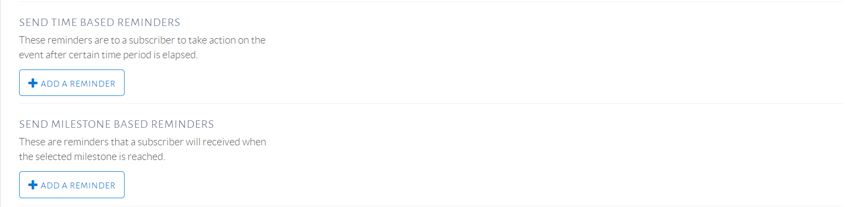 For Action-Based Events, the customer must complete an action to receive the product of an event. Time-based & Milestone-based reminders can be added as well.