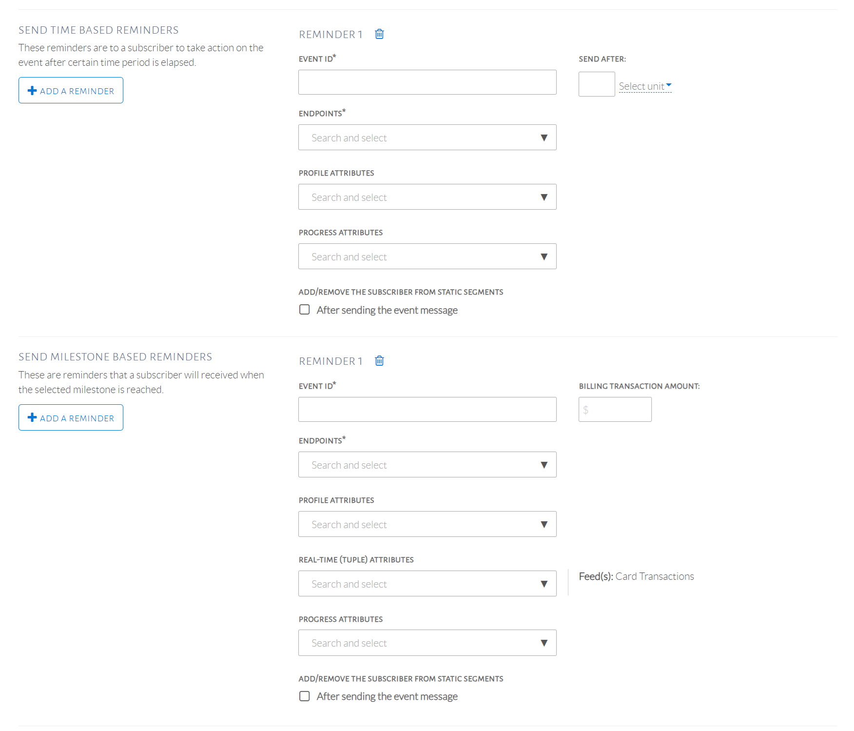 Upon clicking Add a Reminder to both options, the same options as a message-only event appear with a time and amount threshold for time and milestone based reminders respectively. The image below shows these fields. Once those thresholds are reached, another event is triggered by the system and forwarded to the selected downstream systems. Multiple time and milestone based reminders can be set as required.