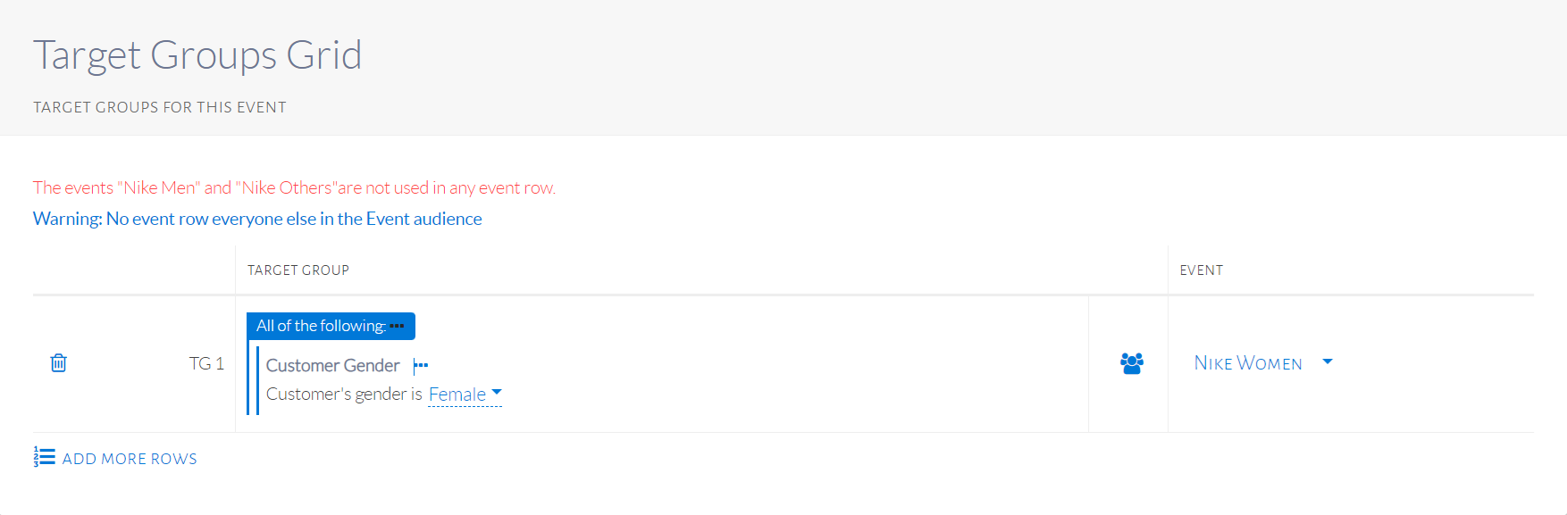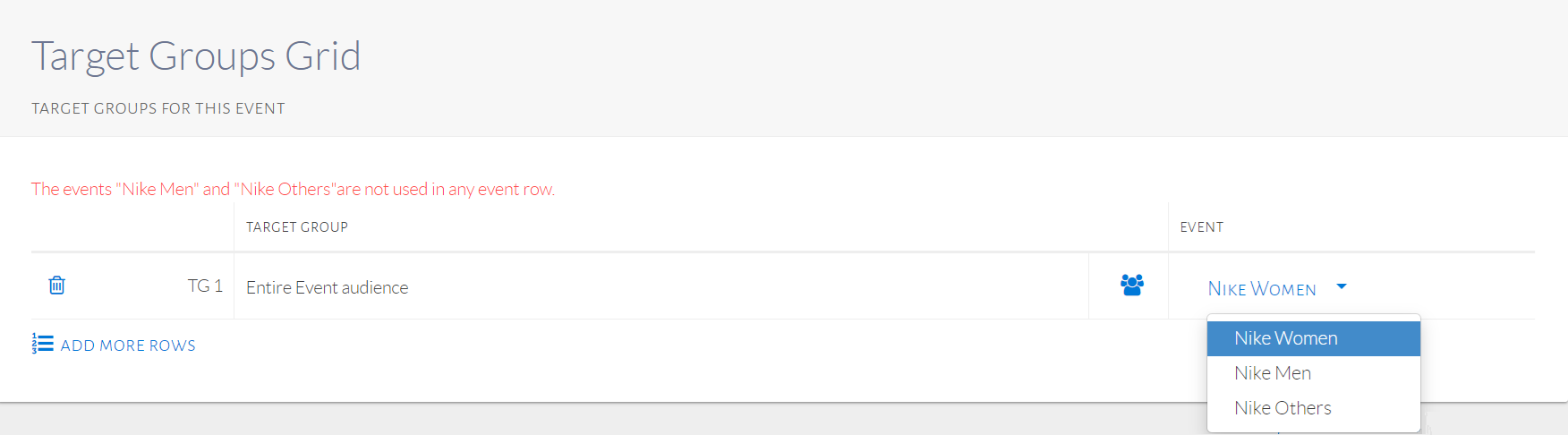 Assign an event to a specific target group as seen in the image below. Click on the orange icon near the event drop-down, to choose the conditions for each target group.