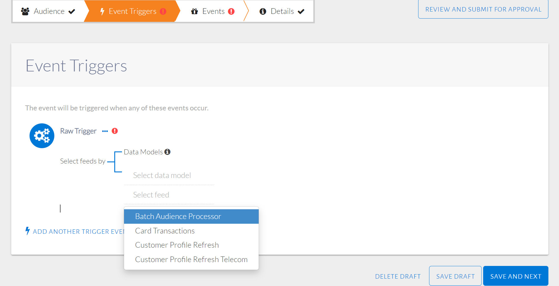 The raw trigger will be displayed as in the image below where the user can select either a Feed Name or a Data Model for the trigger to filter by. A Feed is an organized set of attributes or aggregates. A Data Model is an abstract model that can be applied to different feeds.