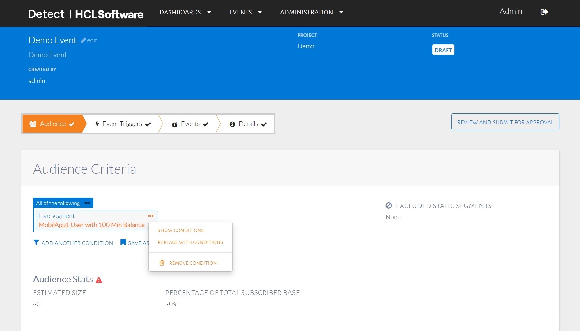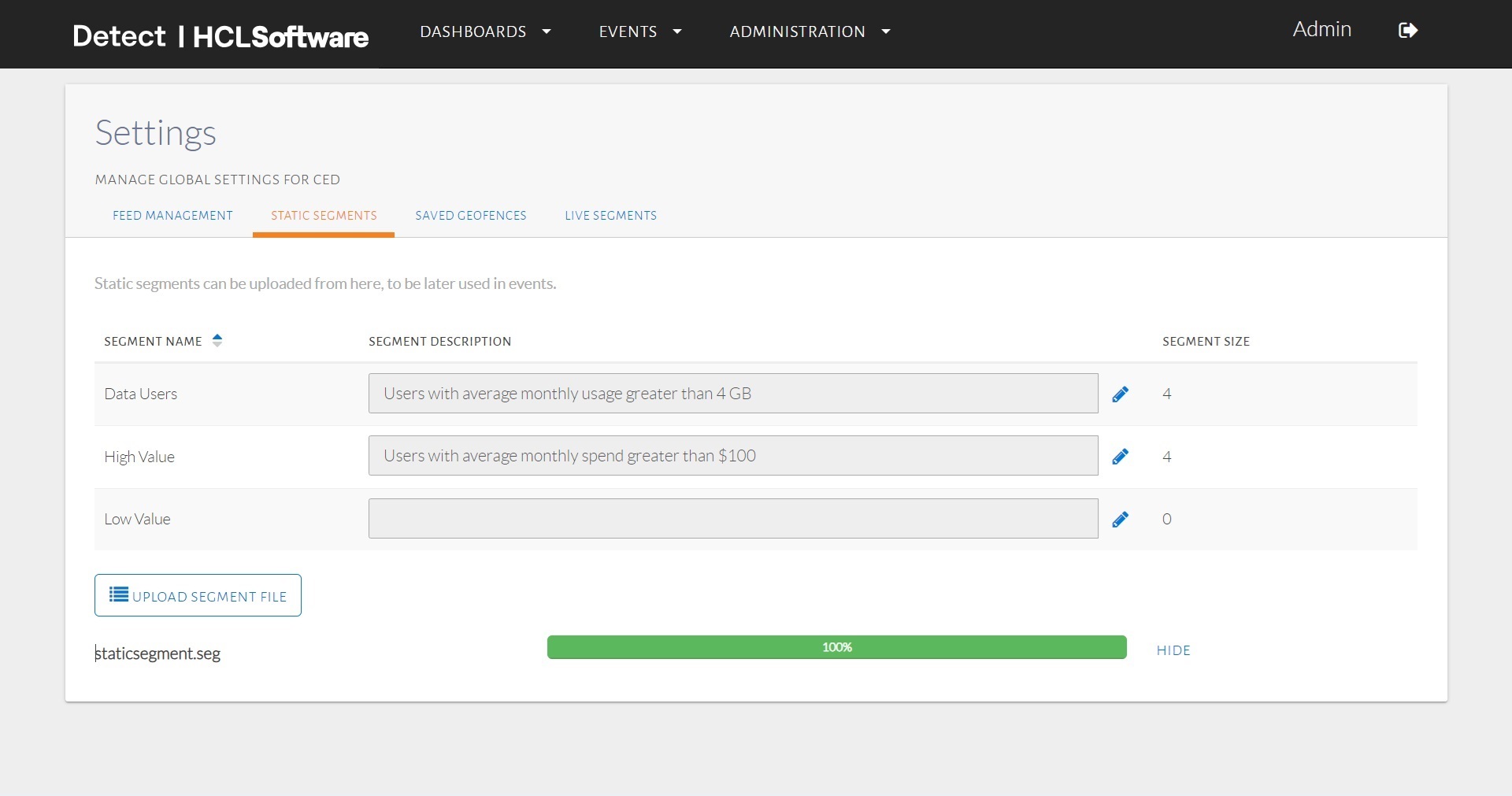 Segments are groups of customers with some similarities, setup segments based on preset conditions (Live), or through user selection list (Static). Grouping customers into Segments helps target them more appropriately or continuously across events with Detect. Detect supports 2 types of segments, Live & Static HCL Detect can make use of subscriber segments. Such segments can be used to include or exclude a group of subscribers from being considered as subjects for a trigger.