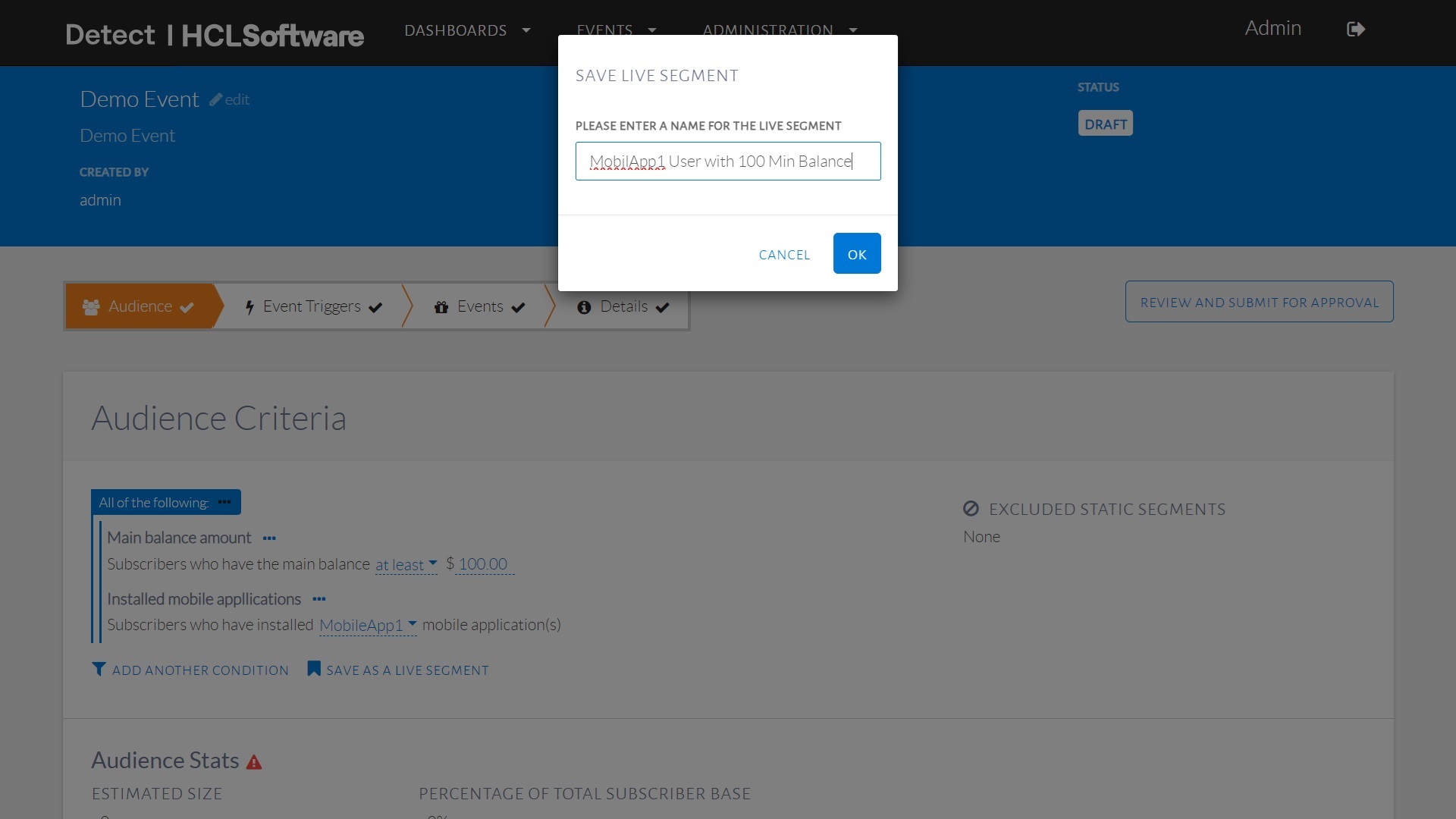 Detect allows the user to enter a set of audience conditions and saves customers who meet those criteria in a Live Segment. Detect checks all customers against the defined conditions and maintains the segment over time. This means that Detect adds or removes customers from the segment as they fulfill or stop fulfilling the defined criteria. For example: if you'd like to frequently target customers who have the main balance atleast $100 & who have installed a Mobile App i.e., Facebook, this can be saved as a Live Segment.