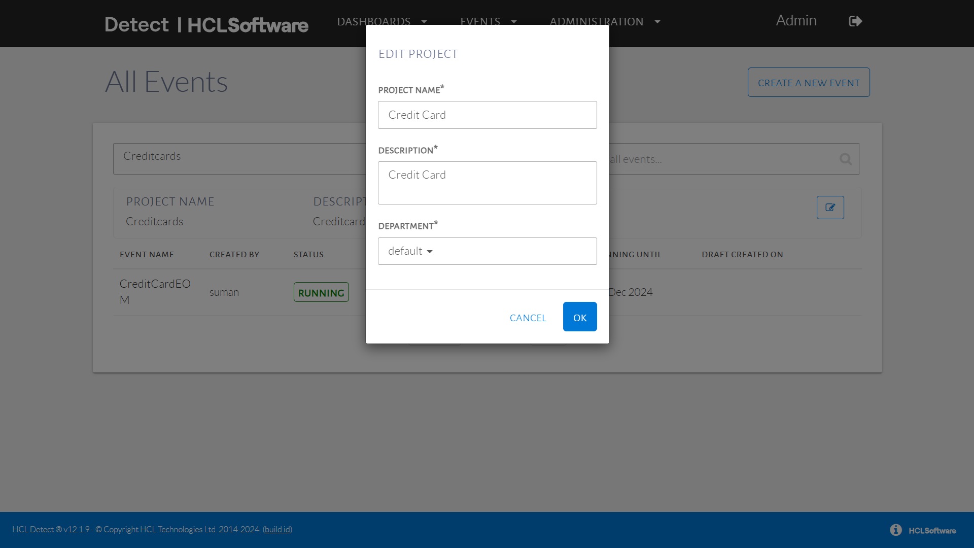 The All Events page displays the project name, project description, search option to search all events and lists all the events specific to the selected project as shown below.