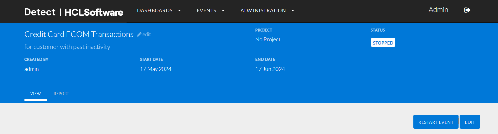The event status is changed to Stopped and the options are available are shown in the image below.