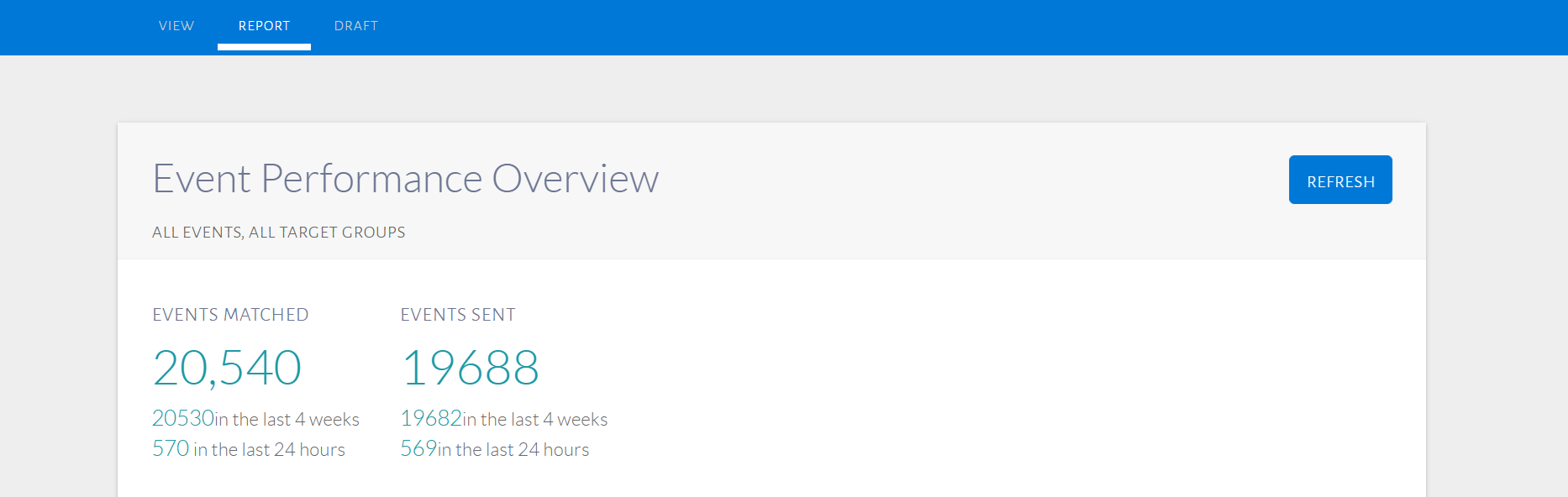 On the Report tab, event Performance Overview displays data about the Events Matched, Events Sent, Events Redeemed, Response Rate and Average Response Time. A bar chart visualizing this data is also shown, as seen in the image below.