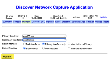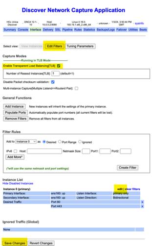 /usr/local/dncauser/etc/dcx-conf.xmlfile, e.g. the file will contain the following as an example:dcx-conf.xml<PrimaryInterface>eth0</PrimaryInterface>Key Description Primary Interface eth0 Listen Interface primary only Secondary Interface None Listen Direction Bidirectional Desired Traffic Port 80 and 443