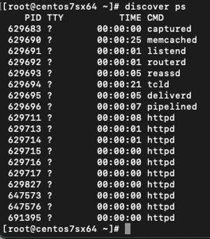 Verify again that all DNCA processes are running by using the discover ps command as before. The expected output is as per the screenshot below, seeing multiple running instances of those processes is possible based on configuration.