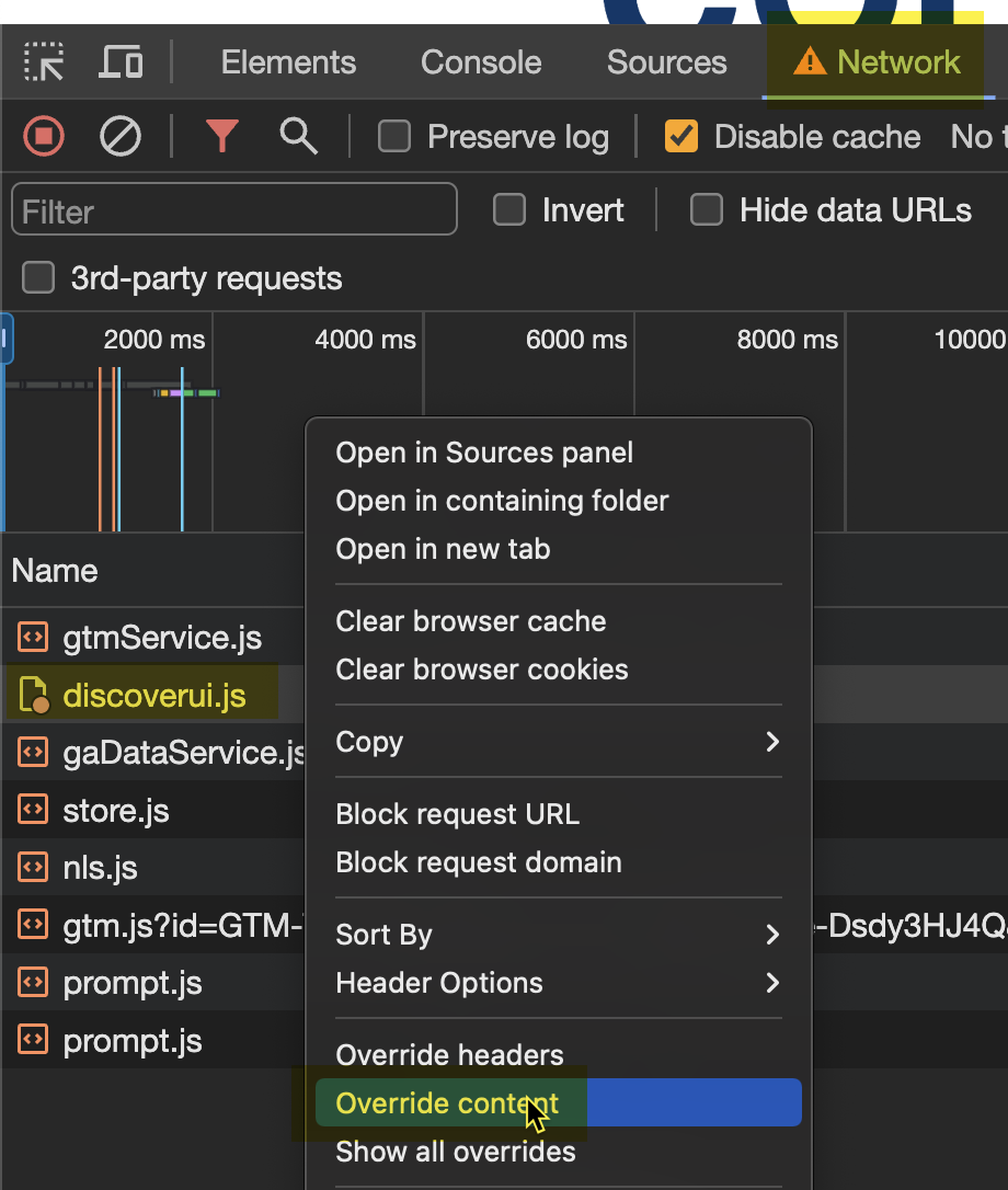 Click the Network tab, at this point you may need to refresh the browser page to show the list of files shown in the Name column. Right-click the file listed as 'discoverui.js' and select the Override content option.
