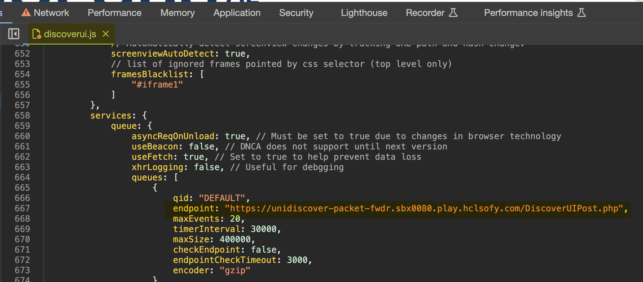 The discoverui.js file will now be shown, it contains many lines of code however you are only required to change one setting shown in the screenshot below. Replace the endpoint url only with the once listed as your packet forwarder or endpoint.