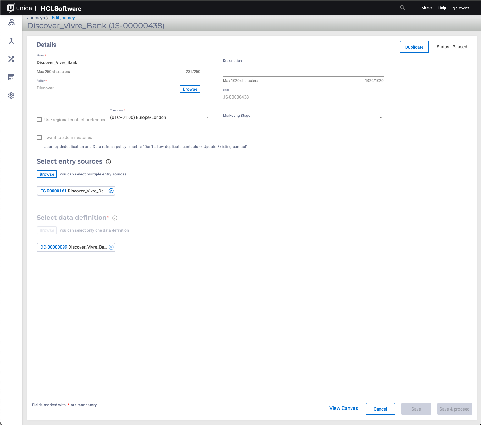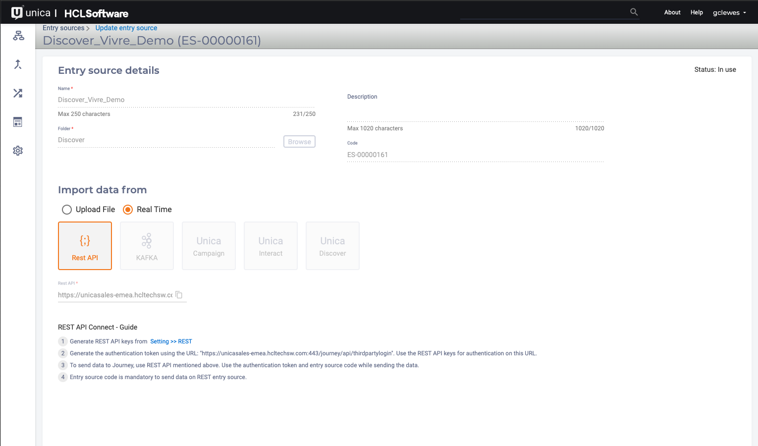 Key Value Journey Entry Source API Client SecretClient Secret from step 1 of the Unica Journey configuration steps Journey Entry Source API ClientIDClientID from step 1 of the Unica Journey configuration steps Journey Entry Source API Serverhttps://{unica_domain}/journey/api/ Journey Entry Source TypeREST Output TypeJOURNEY