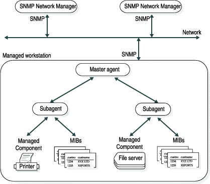 A network can have multiple SNMP Network Managers. Each workstation can have one master agent. The SNMP Network Managers and master agents use SNMP protocols to communicate with each other. Each managed component has a corresponding subagent and MIBs. SNMP does not specify the protocol for communications between master agents and subagents.
