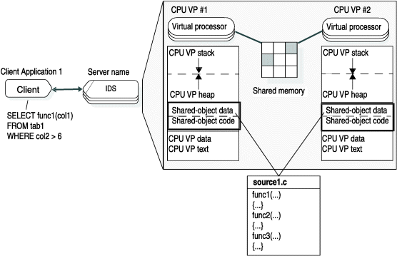 In the preceding figure, assume that the func1(), func2() and func3() functions are registered as user-defined functions with the CREATE FUNCTION statement and linked into the source1.so UNIX™ or Linux™ shared-object file. The client application calls the func1() user-defined function within a SELECT statement. The routine manager loads the source1.so file into memory, if this file is not yet loaded. For subsequent references to these UDRs, the routine manager can skip the shared-object load.