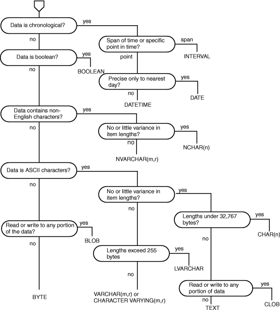 The following figure shows a decision tree that summarizes the choices among built-in data types. The choices are explained in the following sections.