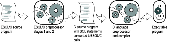 After you have created the program file, you run the esql command on that file. By default, the preprocessor runs first and translates the embedded SQL statements in the program into function calls that communicate with the database server. The preprocessor produces a C source file and calls the C compiler. The C compiler then preprocesses and compiles your source file and links any other C source file, object file, or library file the same way as any other C program. If esql does not encounter errors in one of these steps, it generates an executable file. You can run the compiled program as you would any C program. When the program runs, it calls the library procedures; the library procedures set up communications with the database server to carry out the SQL operations.