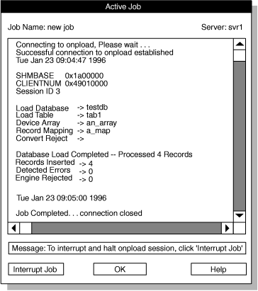 When the Active Job window reports that the load job is complete, click OK to return to the Load Job Select window.