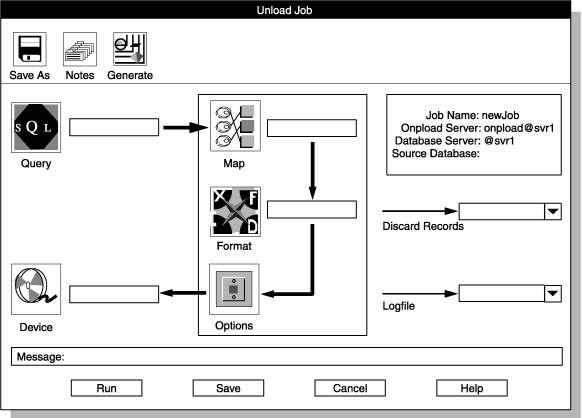 The Unload Job window appears, as the following figure shows. The ipload utility windows, provides detailed descriptions of the buttons in the Unload Job window.
