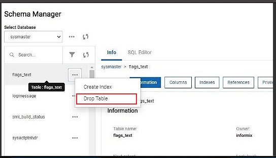 - Click on menu option (3 dots) next to this table and select Drop Table from the dropdown menu to drop a table.