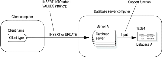 The database server calls the input function when it receives the external representation of an opaque type from a client application. For example, when a client application issues an INSERT or UPDATE statement, it can send the text representation of an opaque type to the database server to be stored in an opaque-type column. The database server calls the input function to convert this external representation to an internal representation that it stores on disk.