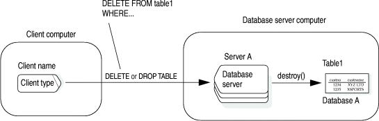 The following figure shows when the database server executes the destroy() function. Figure 1. Execution of the destroy() support