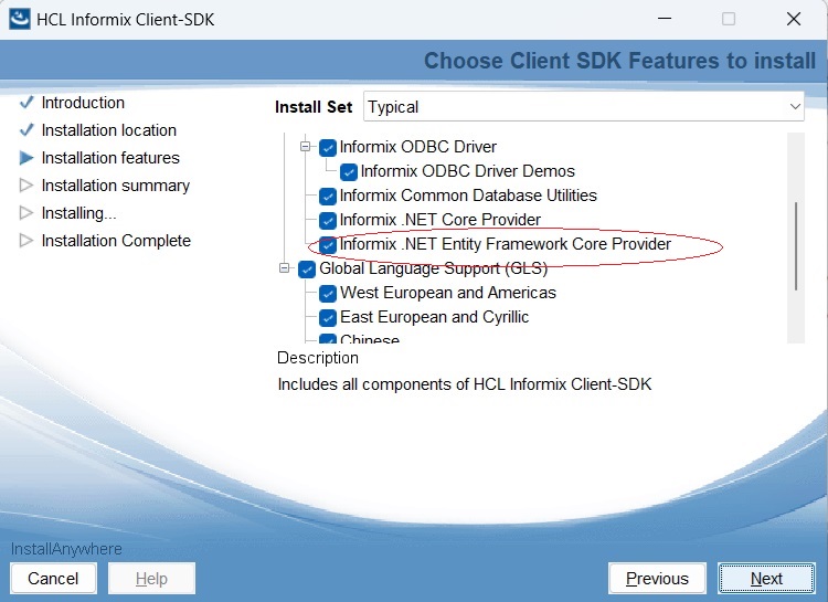 You can install the Informix .NET EF Core Provider with the HCL® Informix® Client Software Development Kit (Client SDK) through a typical or custom installation.