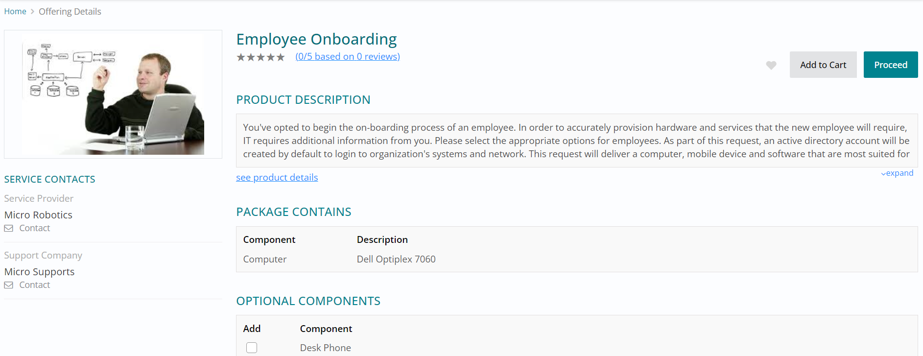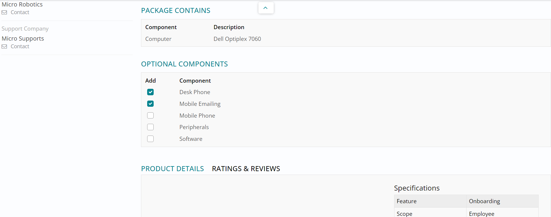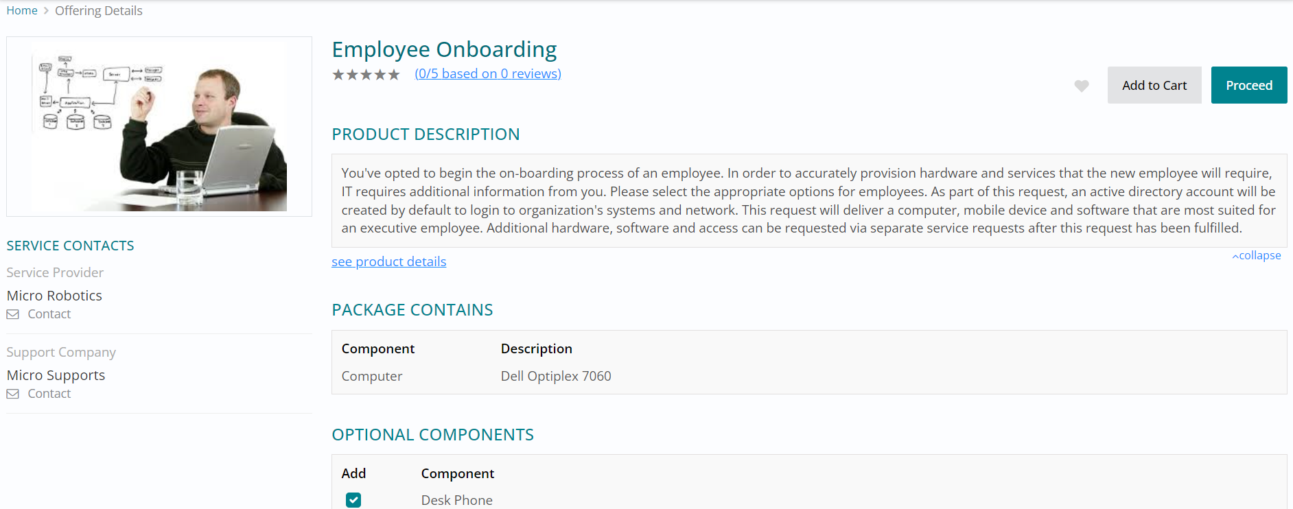 - You can view the offering details such as its description, optional components, contacts, specifications, reviews and ratings.