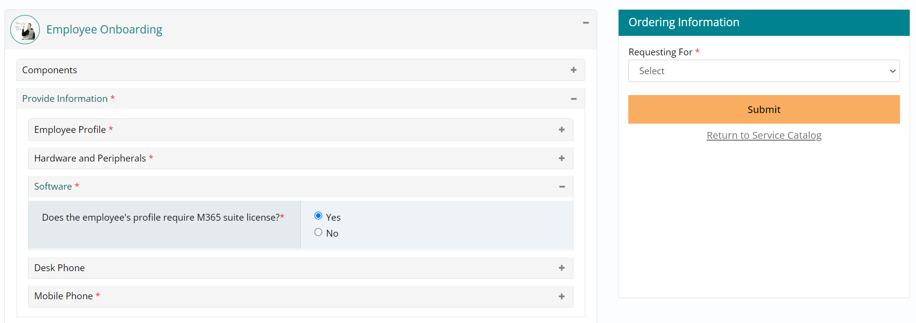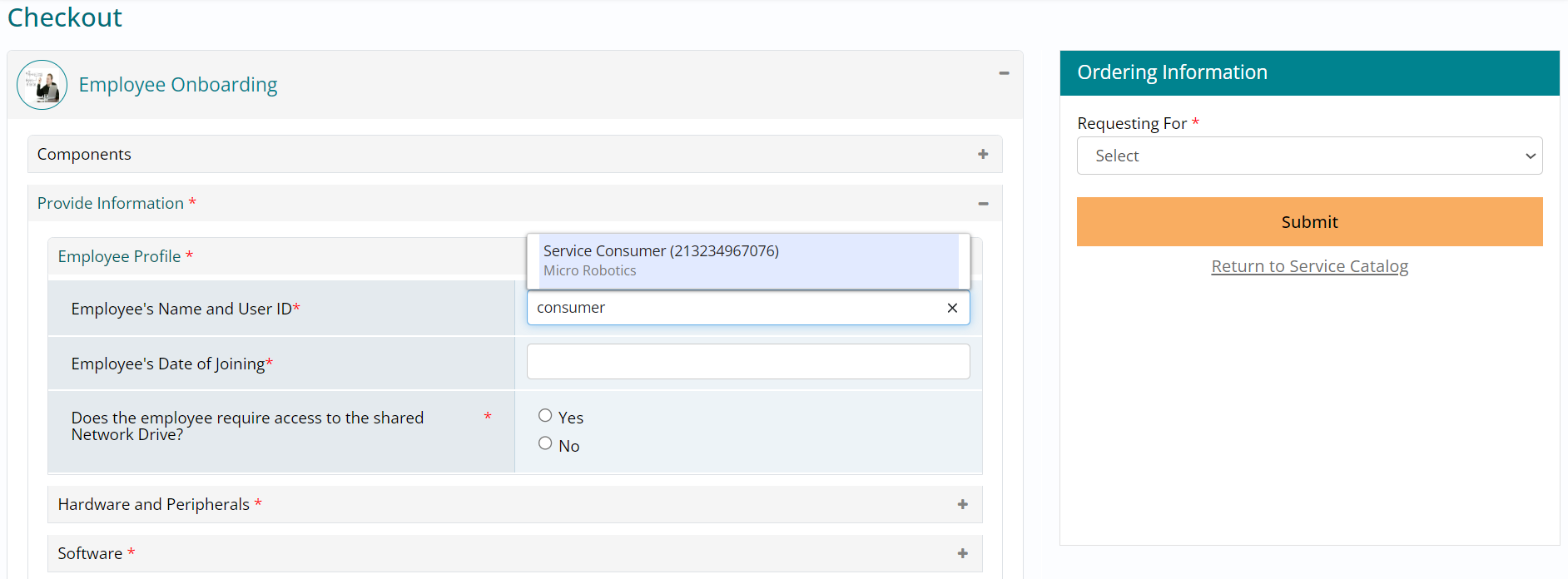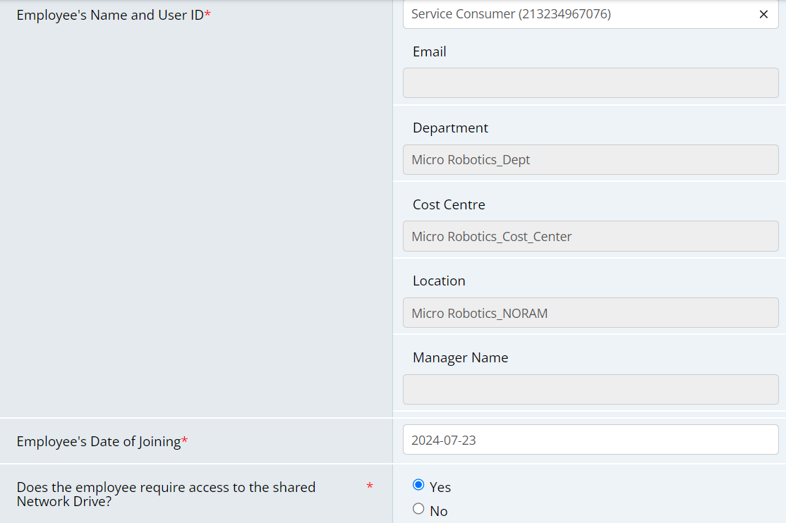 - Upon selecting Service Consumer as the response to the Employee’s Name and User ID question, you will see that the consumer’s department, cost centre, location details are populated automatically from the foundation data.