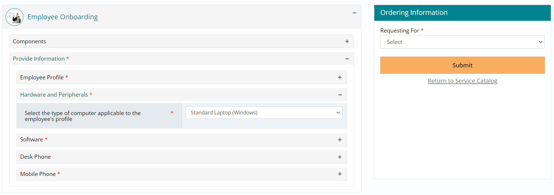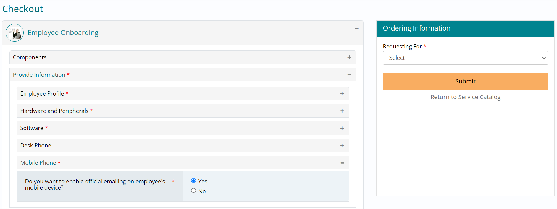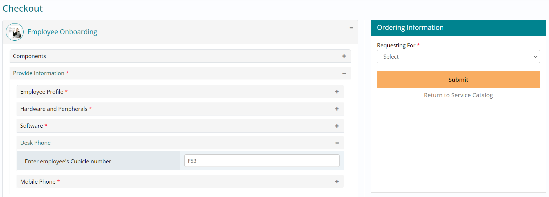 - Upon selecting Service Consumer as the response to the Employee’s Name and User ID question, you will see that the consumer’s department, cost centre, location details are populated automatically from the foundation data.