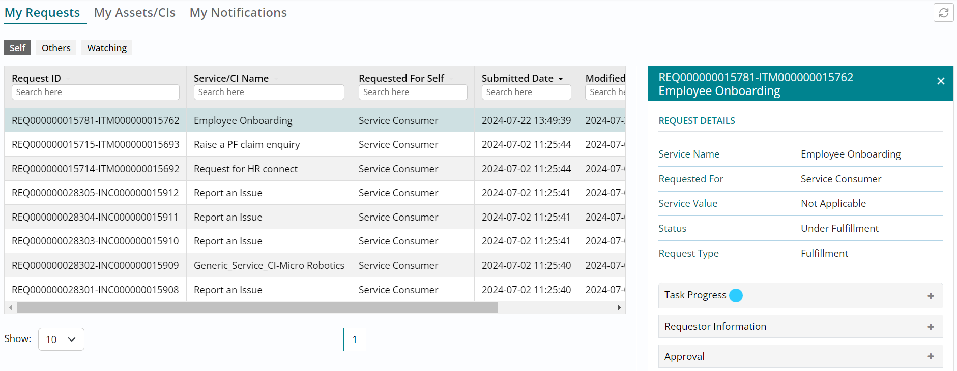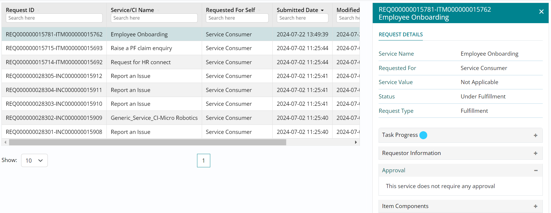 - Click on the request placed and you will see the request details open on the right of your screen.