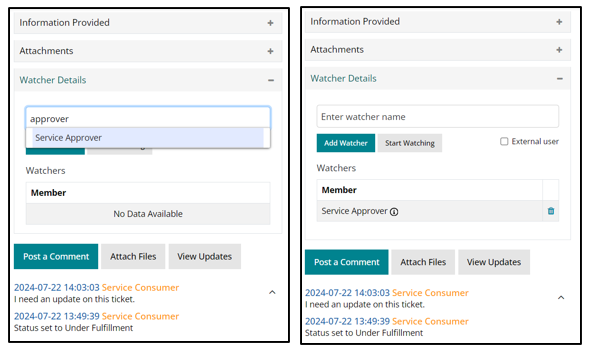 - Left image - Expand Watcher Details section and type in ‘approver’ followed by selecting Service Approver and clicking on Add Watcher. This will ensure that the added watcher will receive all the request updates via notifications.
