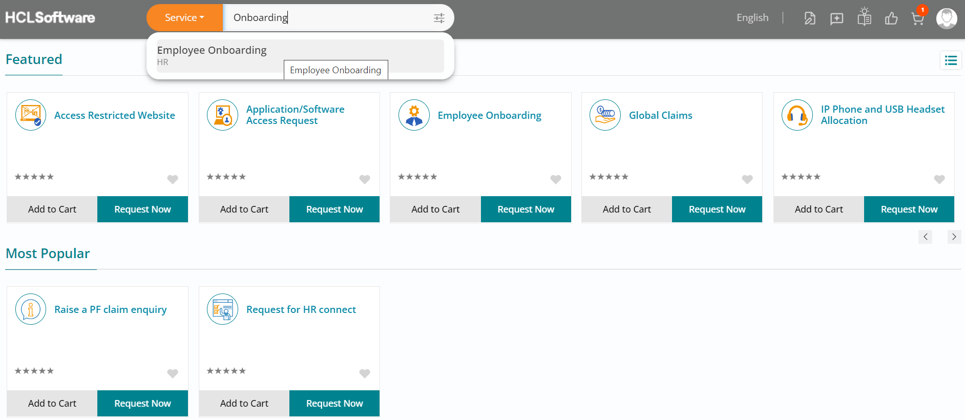 - Type in ‘Onboarding’ on the Global Search section of the consumer homepage and basis the keyword typed in; the related service offerings will appear for selection.