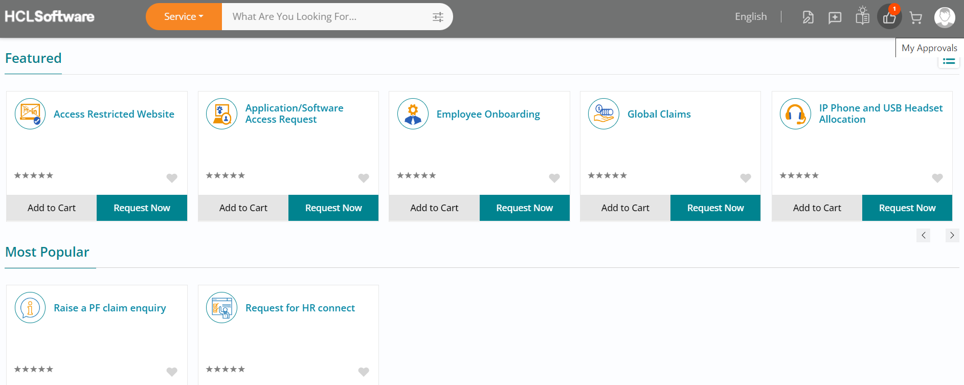 - Upon logging into the HCL BigFix Service Management consumer homepage, you will see all the service offerings available for consumption.