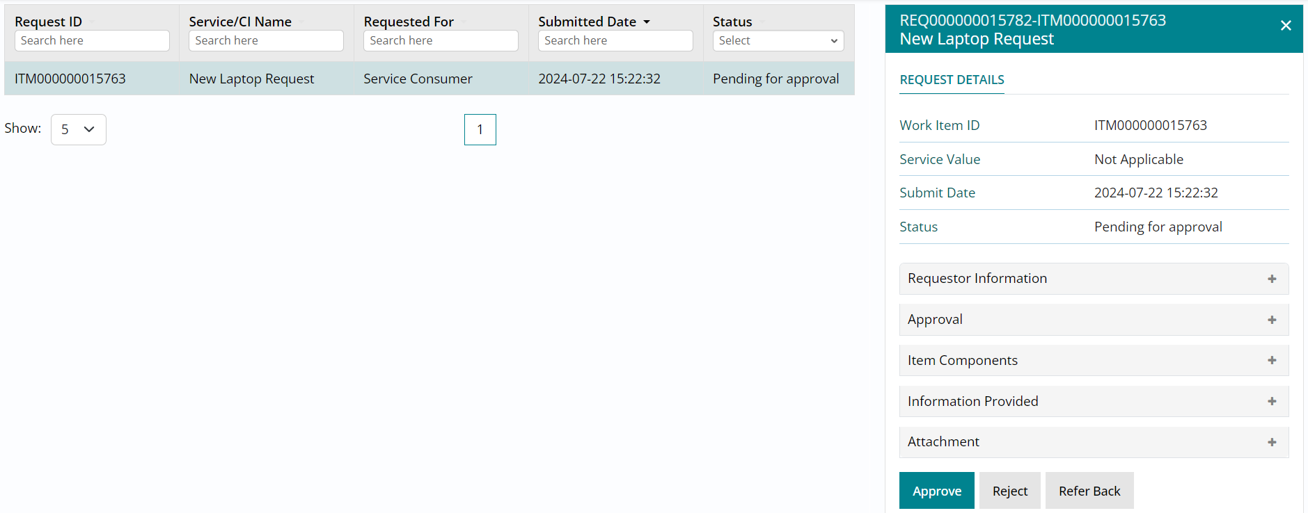 - There are one of three actions that you can take on a request pending approval, namely Approve, Reject and Refer Back.