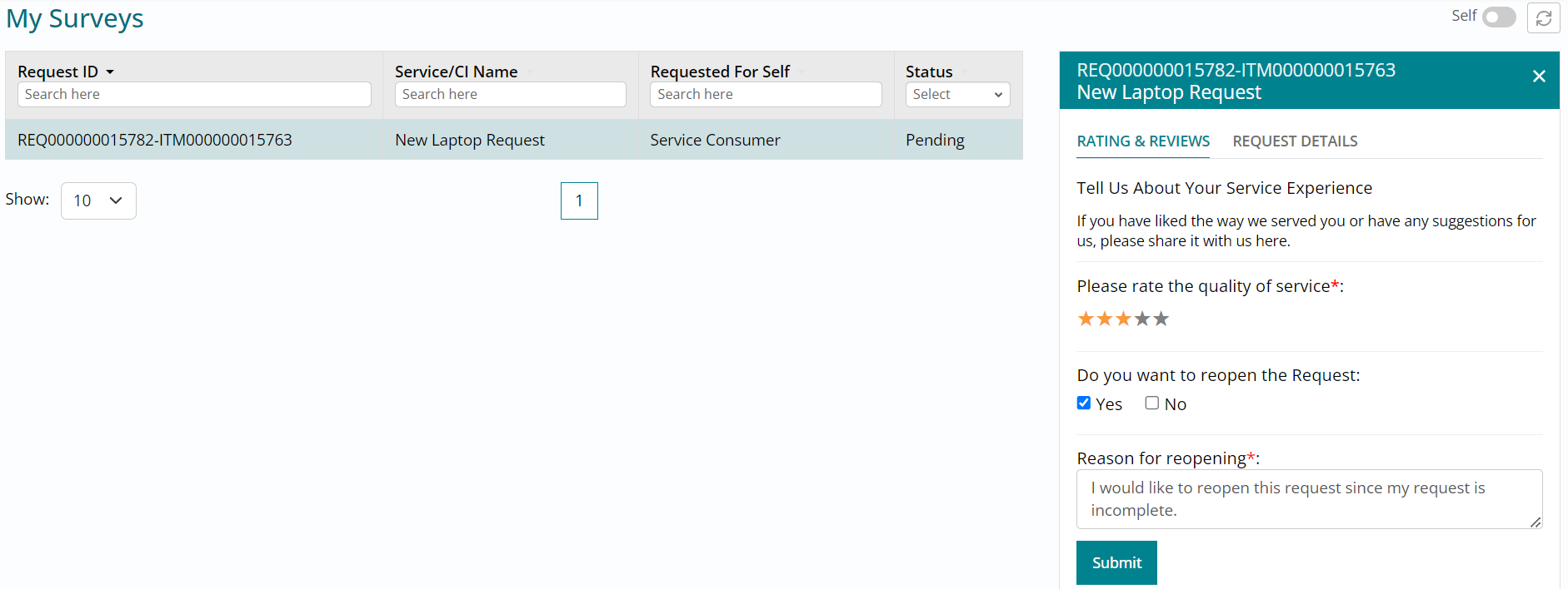 - Type the reason for reopening and click on Submit. The request will be reopened and