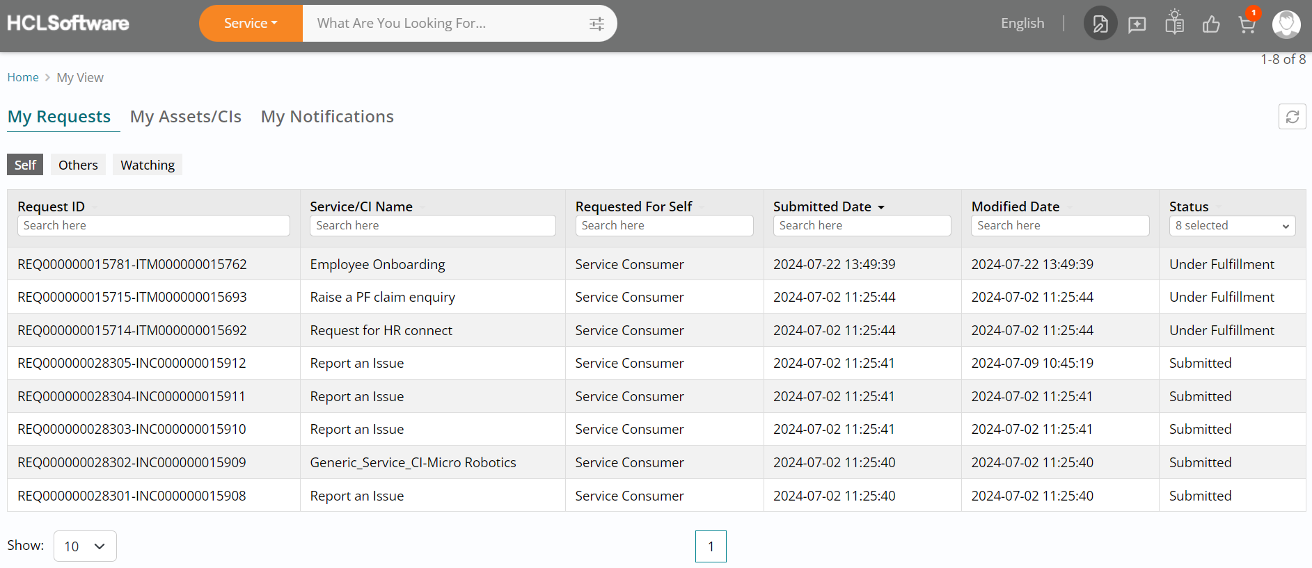 - Upon placing the order / request, you will be automatically navigated to the My Requests section wherein you can view the latest request on top of the list view.
